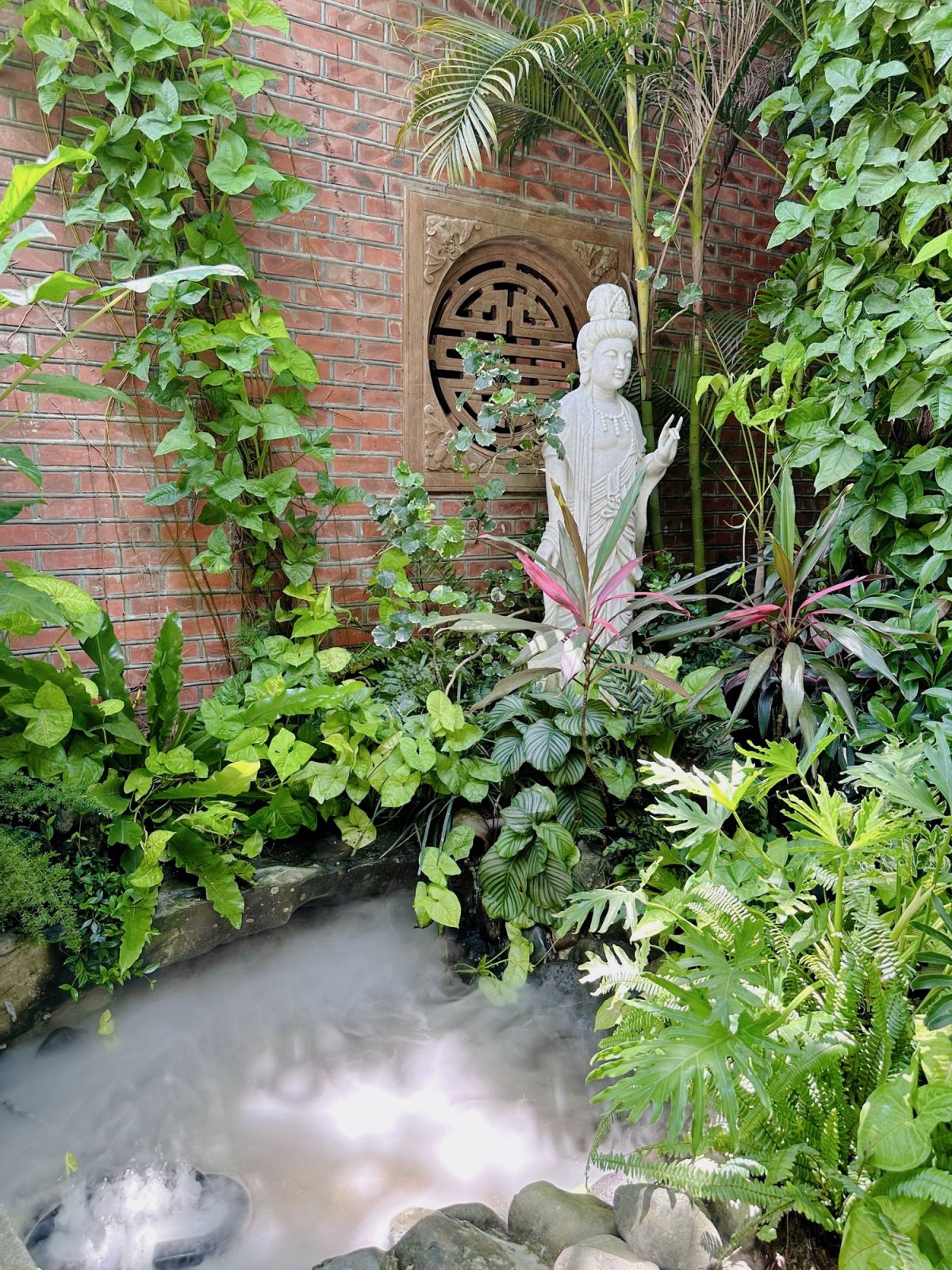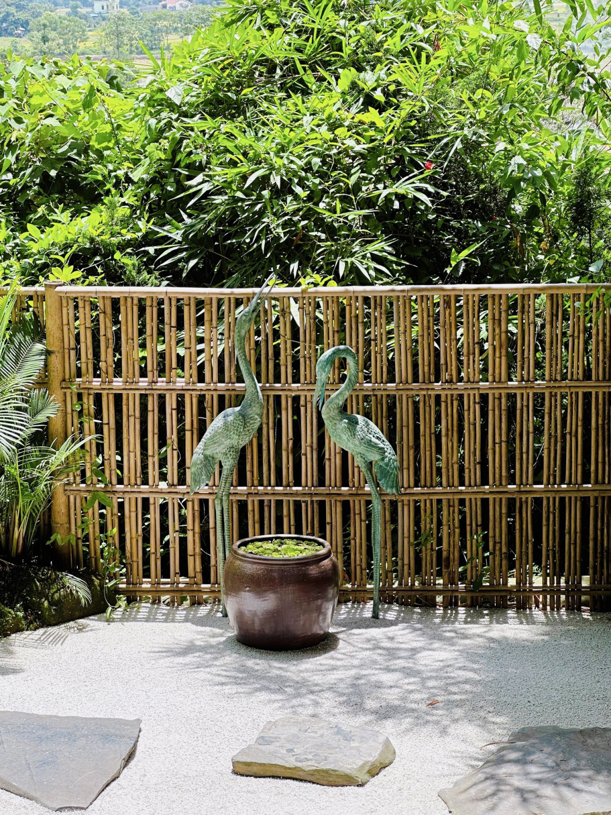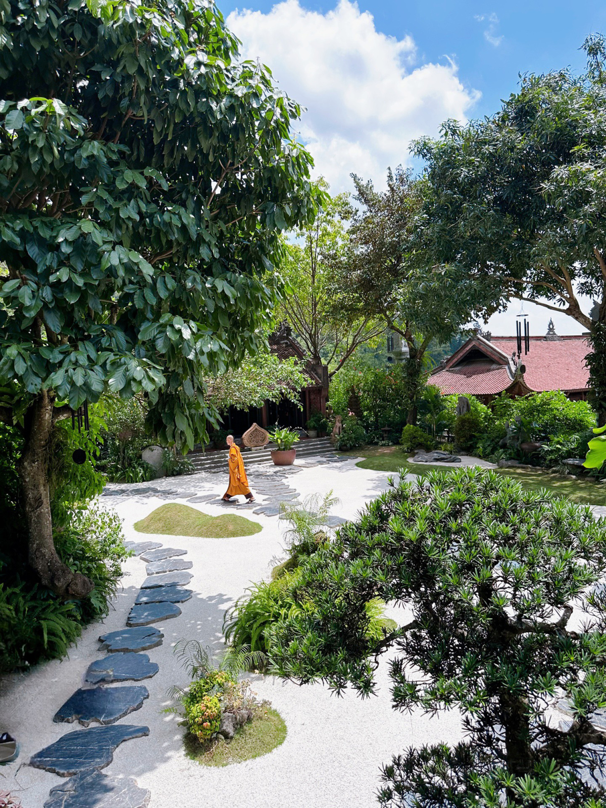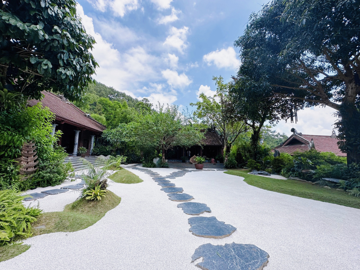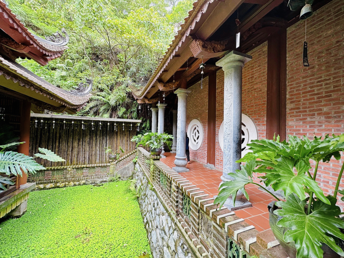 Một góc vườn trang trí gợi nhớ tới những khu vườn Nhật nhưng vẫn tạo nét gần gũi với các chi tiết hàng rào tre, chum nước rất Việt Nam. Vào các dịp lễ, Tết hay cuối tuần, lượng khách tới chùa đông. Nếu có thể, bạn nên chọn đi vào ngày thường để cảm nhận hết vẻ đẹp nơi đây. Ở chùa không có các dịch vụ chèo kéo, mua bán, viết sớ, đổi tiền, tạo thêm sự thoải mái cho du khách.