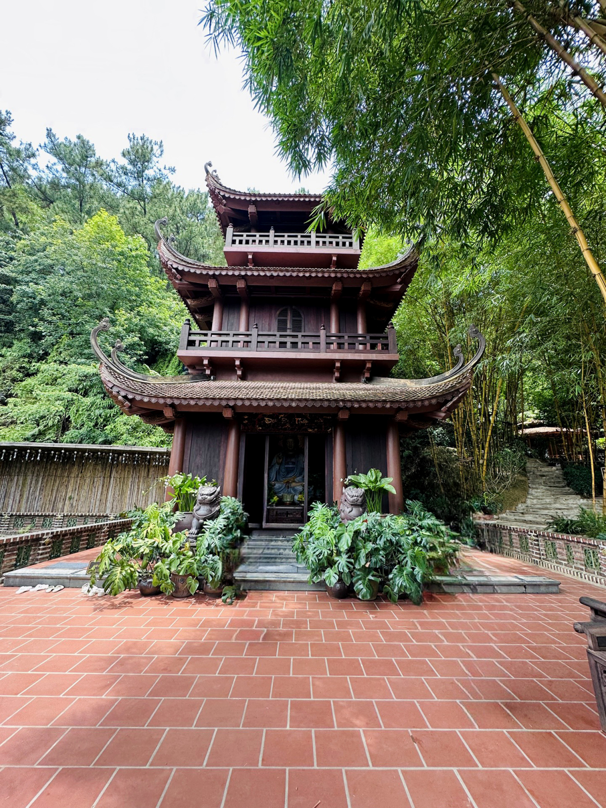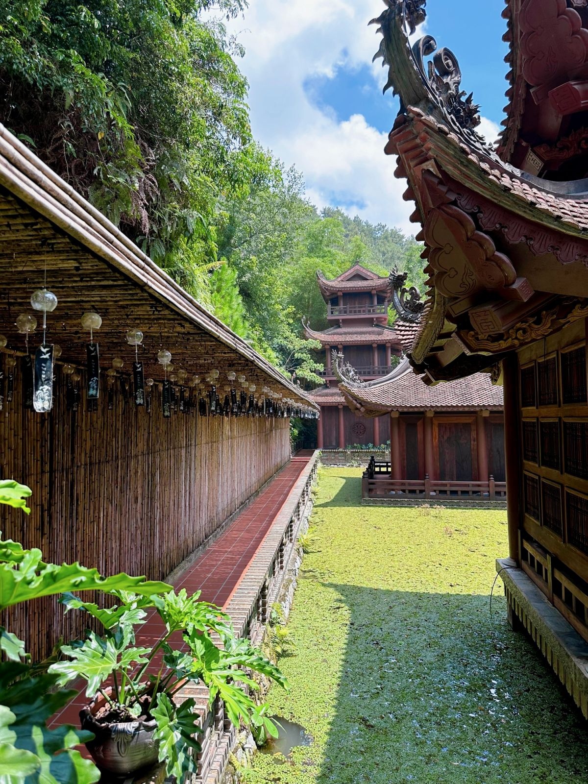 Phần lớn lối đi bộ quanh chùa đều lát gạch đỏ, có mái che không bị nóng chân trong ngày hè. Đi dọc hành lang chuông gió, khách có thể cảm nhận “động trong tĩnh” với tiếng chuông thỉnh thoảng khẽ vang lên hay tiếng ếch kêu trên hồ nước, gió thổi làm sóng khẽ lay động.
